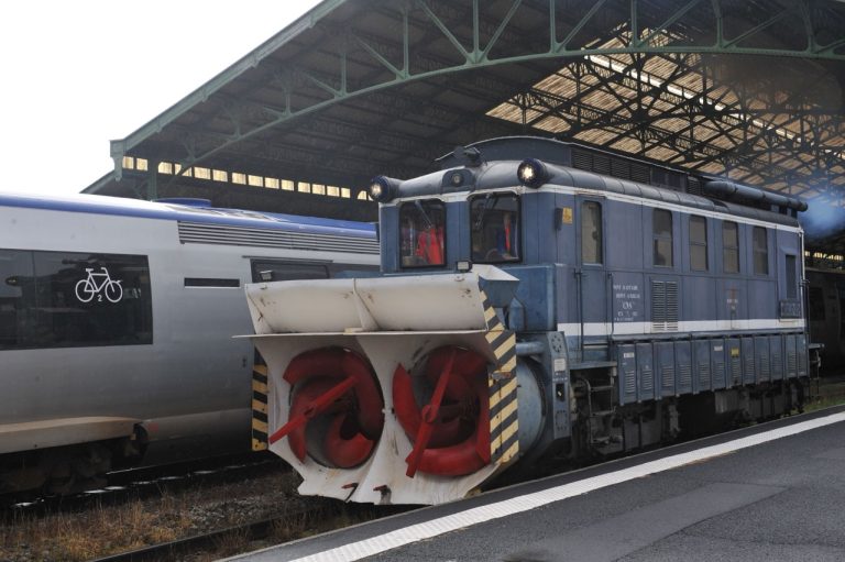 Le chasse-neige (CNS) d’Aurillac évolue par ses propres moyens en gare le 30 janvier 2026, au retour de Neussargues après une marche de formation du personnel. Malgré un enneigement de plus en plus rare du seuil du Lioran, la disponibilité de…
