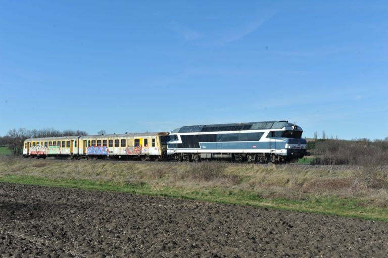 La CC 72084 est réapparue en ce début d’année 2026 pour acheminer l’autorail X-4786, ex-CFT de l’Auxois repris par le CFT du Haut-Forez, des Laumes-Alésia à Pont-de-Dore. Cette curieuse composition colorée est vue du côté de Vertaizon dans la Plaine…